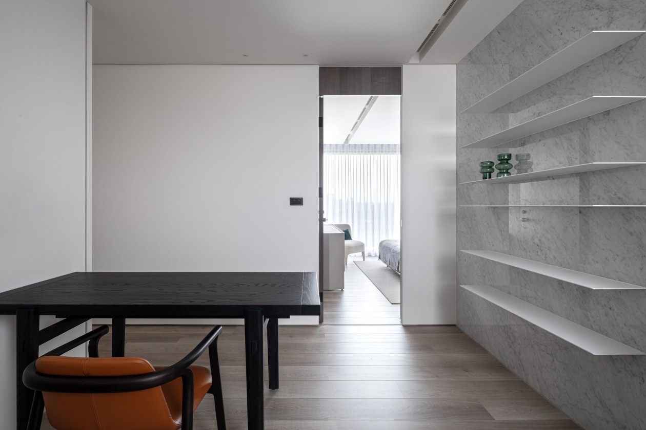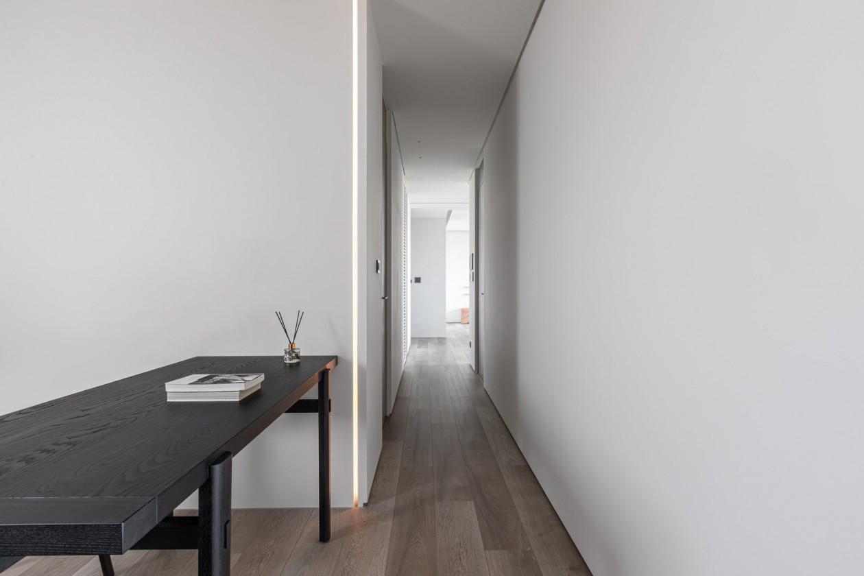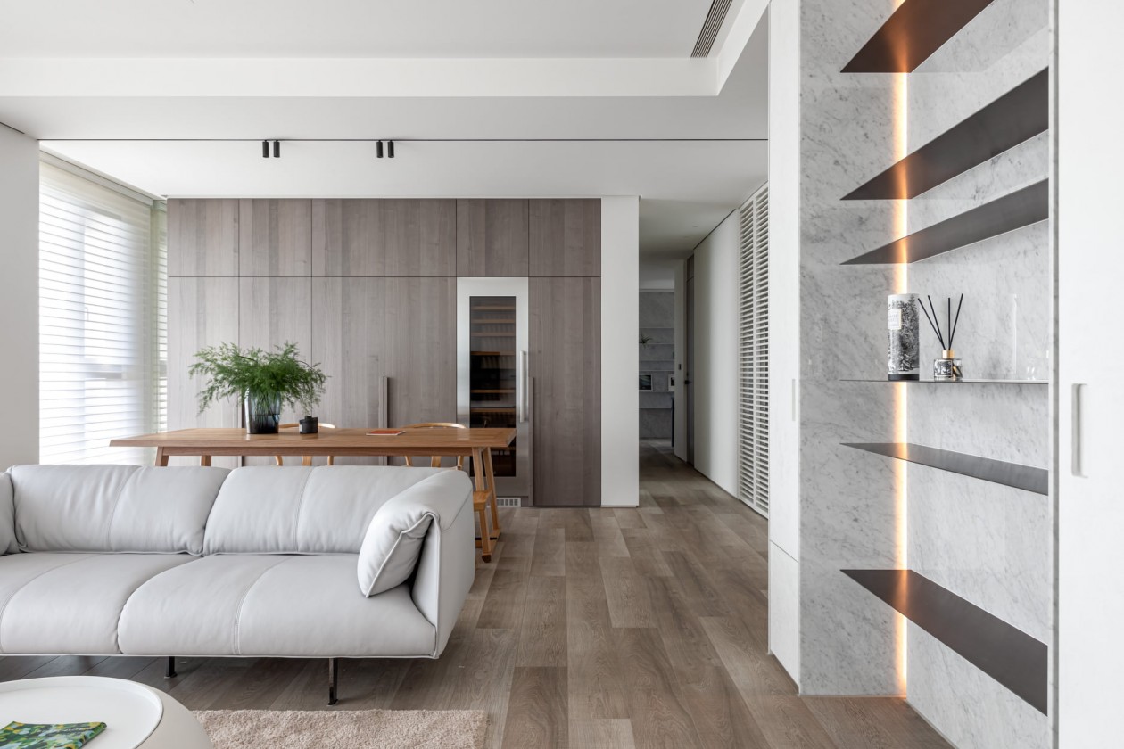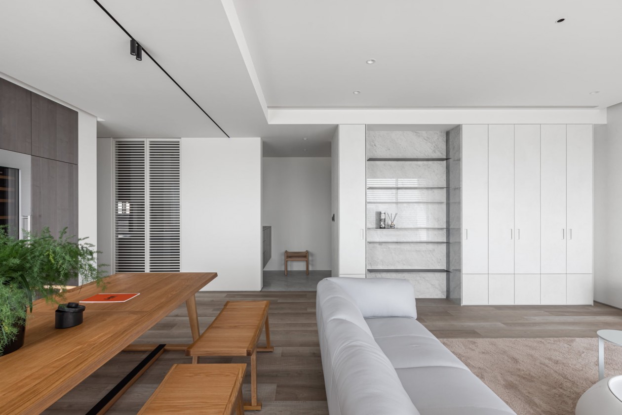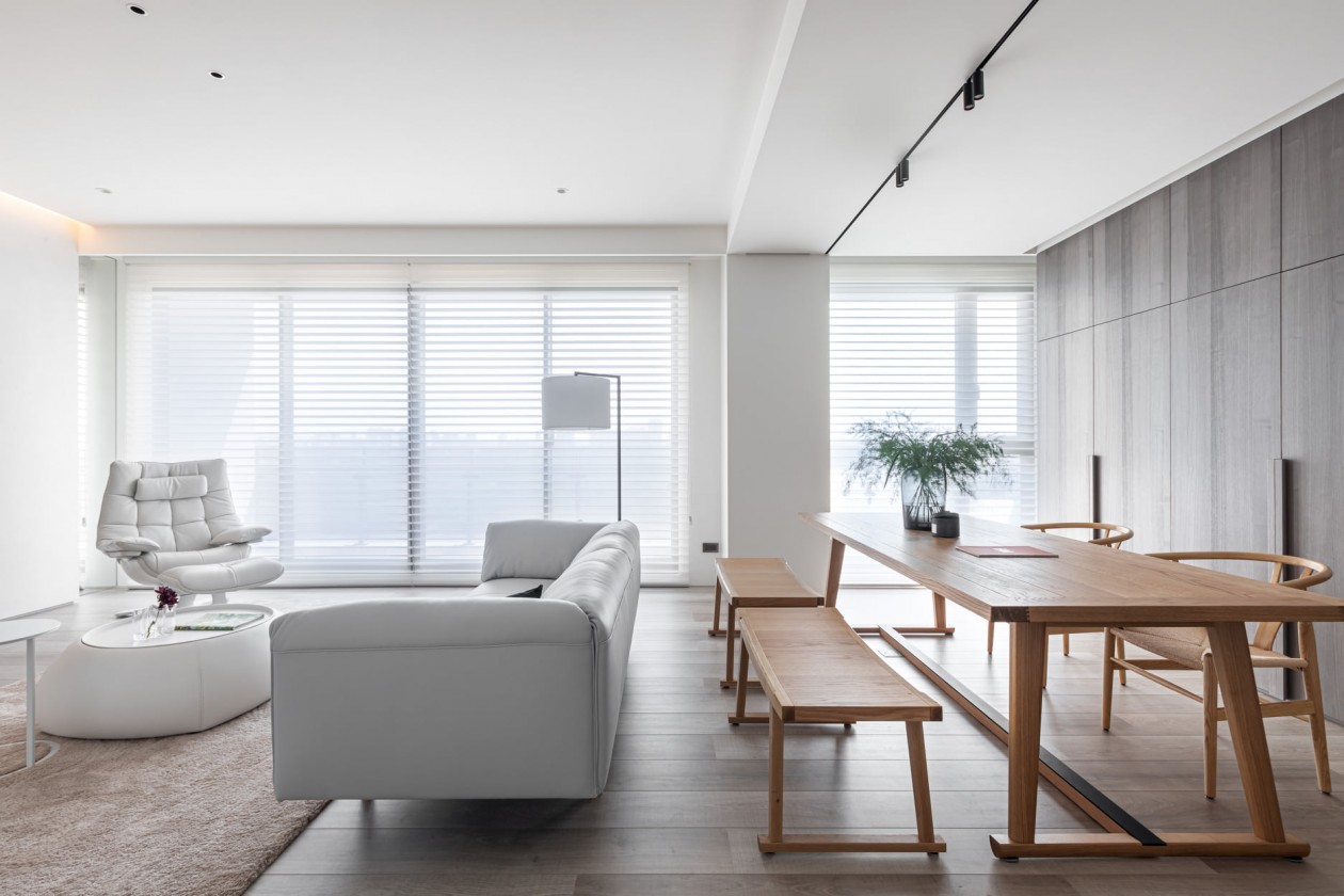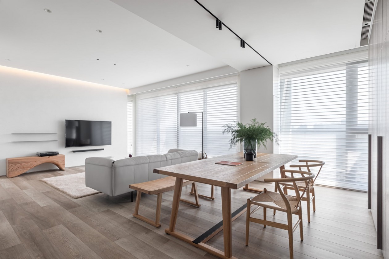 四季的腳步不疾不徐地透過水岸景色佇立在窗臺前,自水岸漫上無限輕柔與自在,透過大面落地窗在漫白的屋里鋪陳各式生活的面向。
