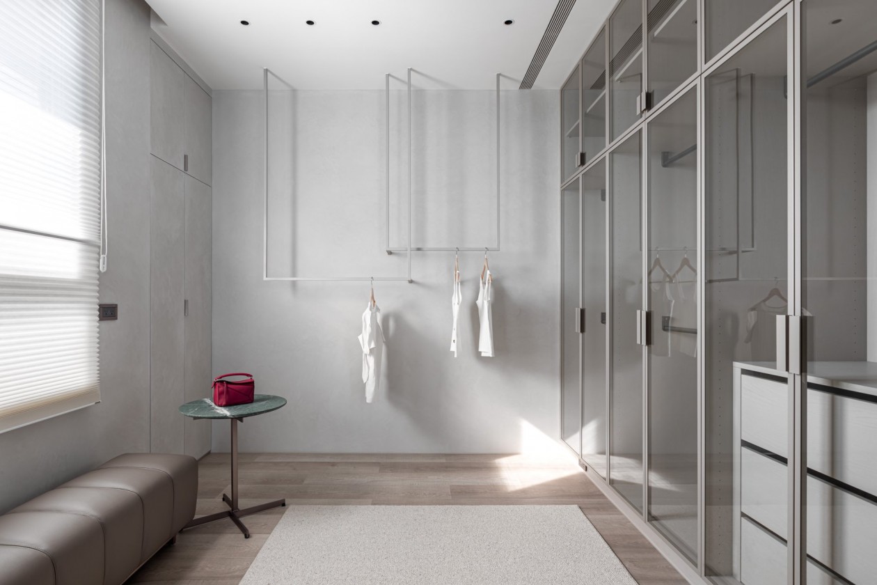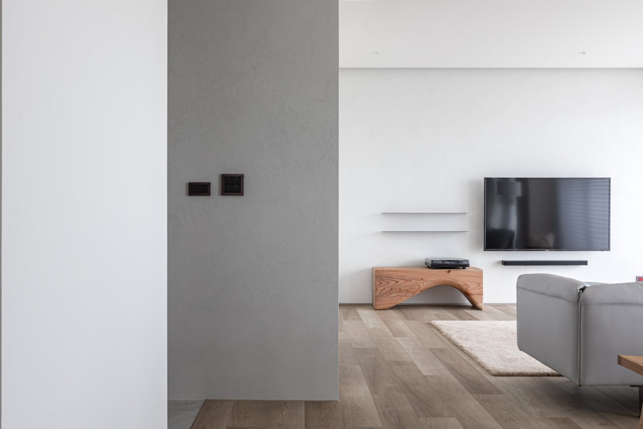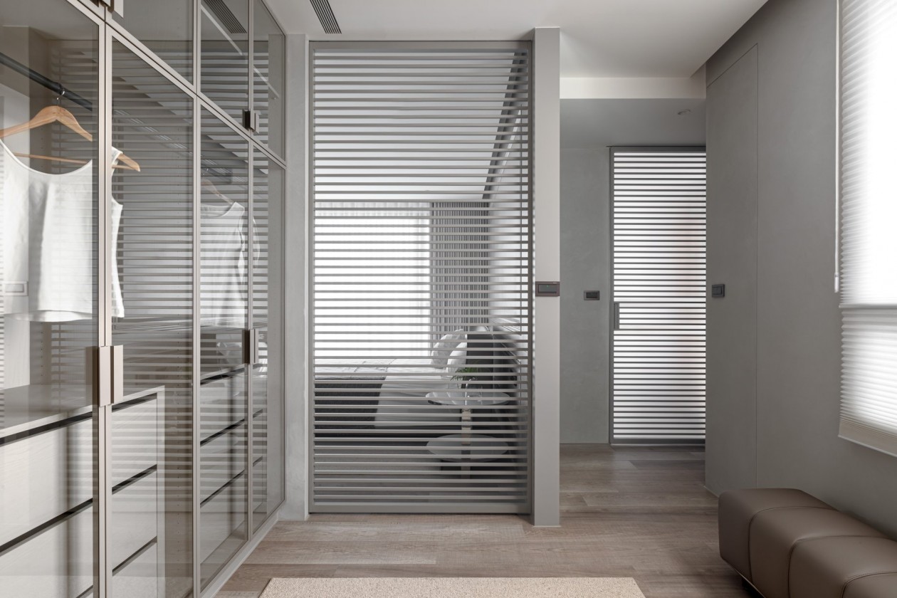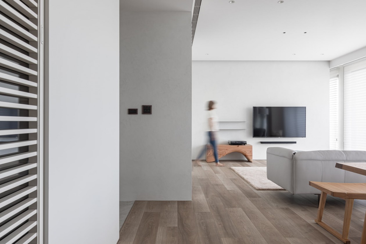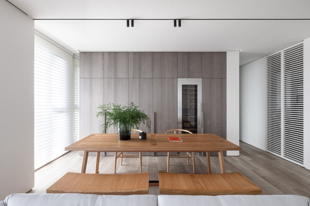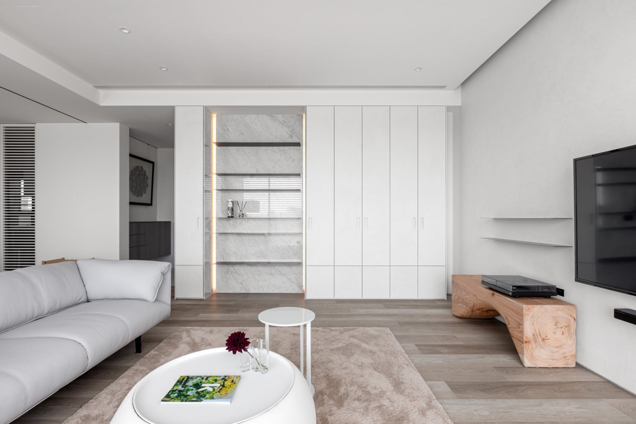四季的腳步不疾不徐地透過水岸景色佇立在窗臺前,自水岸漫上無限輕柔與自在,透過大面落地窗在漫白的屋里鋪陳各式生活的面向。